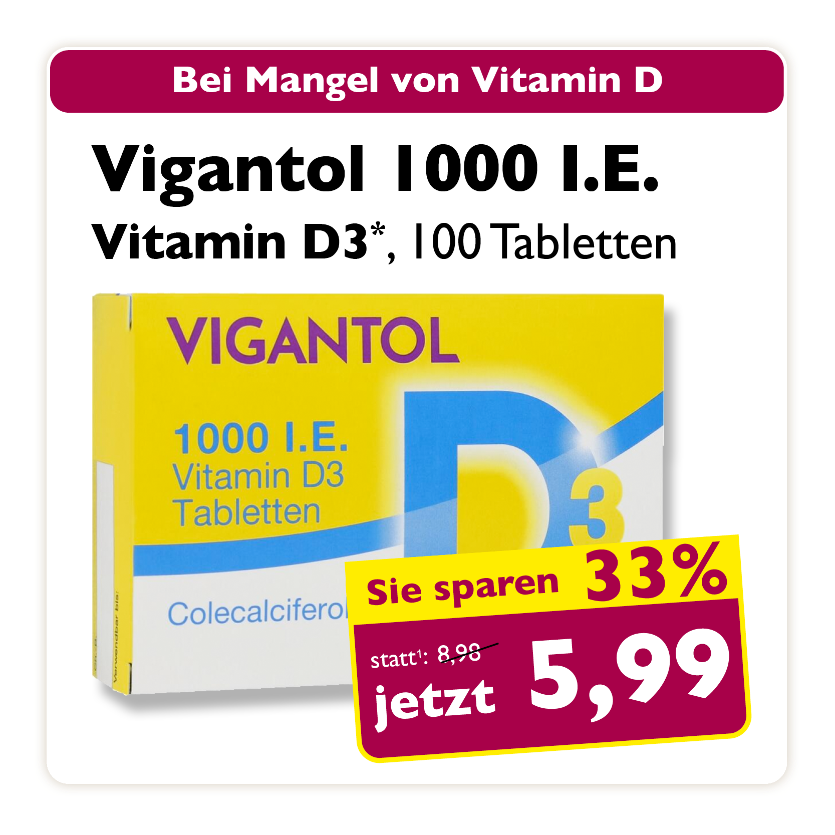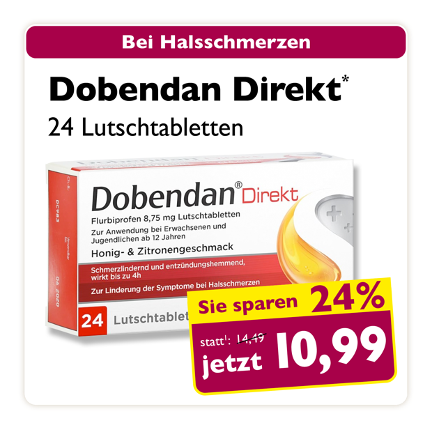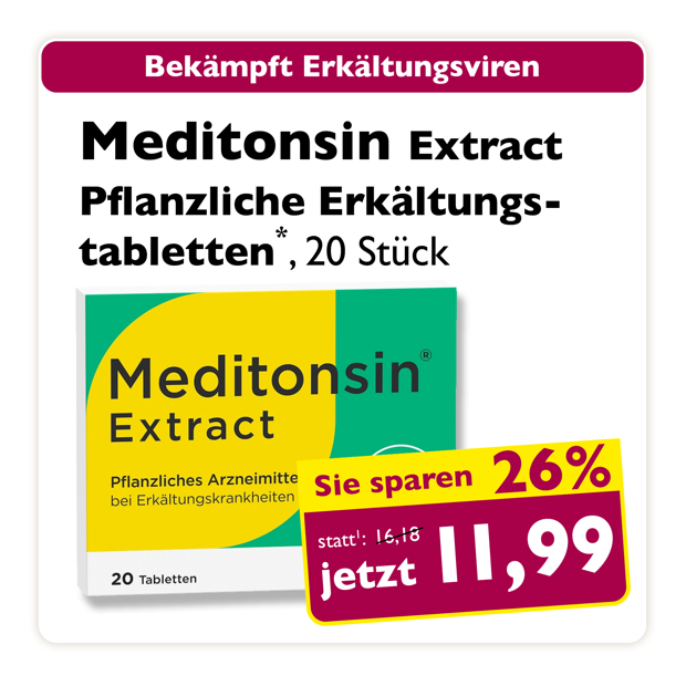 * Zu Risiken oder Nebenwirkungen lesen Sie die Packungsbeilage oder fragen Sie Ihren Arzt oder Apotheker. Abgabe in haushaltsüblichen Mengen. Solange der Vorrat reicht. Änderungen, Irrtümer und Druckfehler vorbehalten – Stand Druckschluss. Alle Preise in Euro inkl. MwSt. Rabatte nicht kombinierbar. Gültig vom 01. bis 31.01.2026. 1 In Apotheken bundesweit einheitlicher Verkaufspreis nach der Großen Deutschen Spezialitätentaxe (sog. Lauer-Taxe), der bei Abgabe zu Lasten der Gesetzlichen Krankenversicherung (GKV) berechnet wird. Es handelt sich nicht um die unverbindliche Preisempfehlung des Herstellers. 2 Unverbindliche Preisempfehlung des Herstellers.