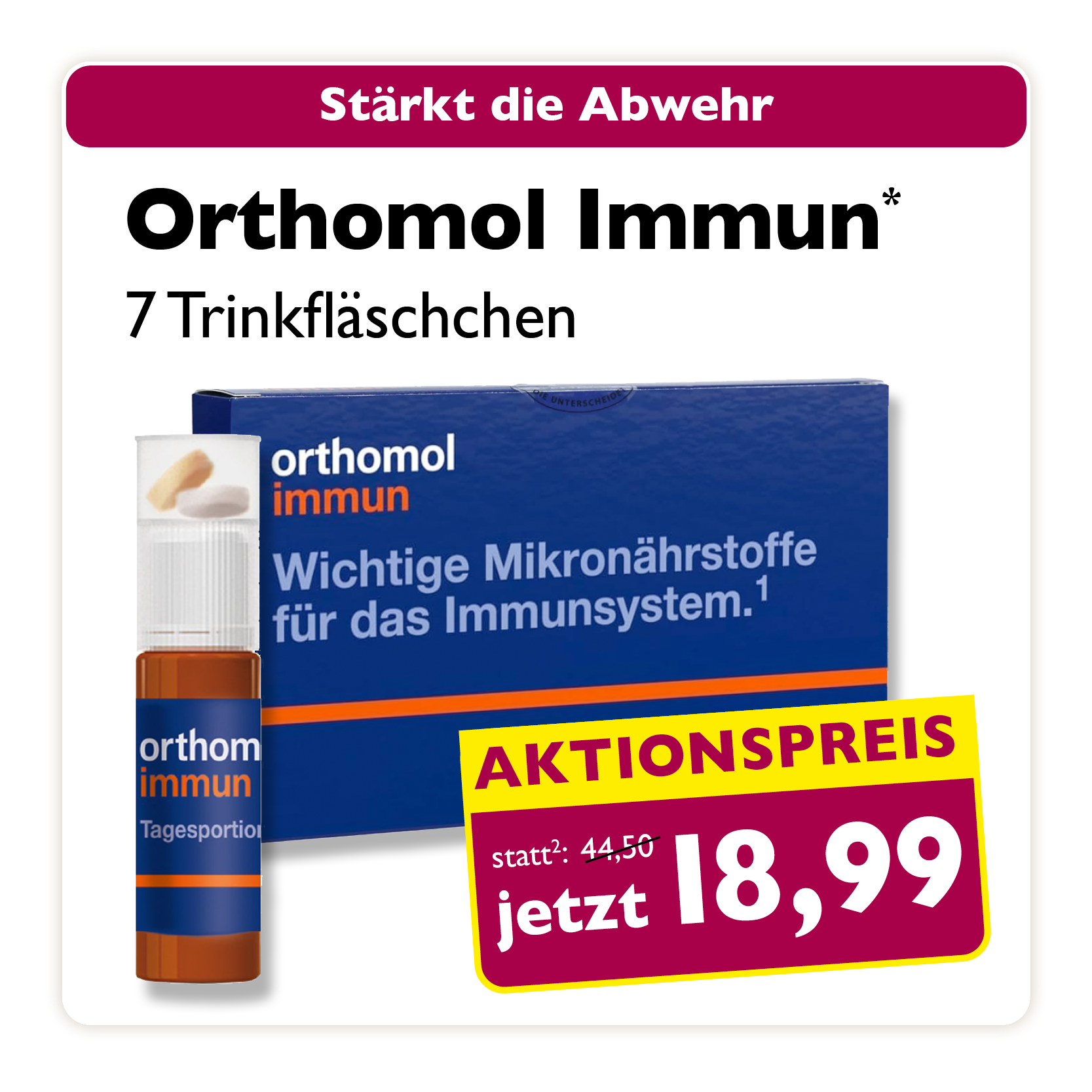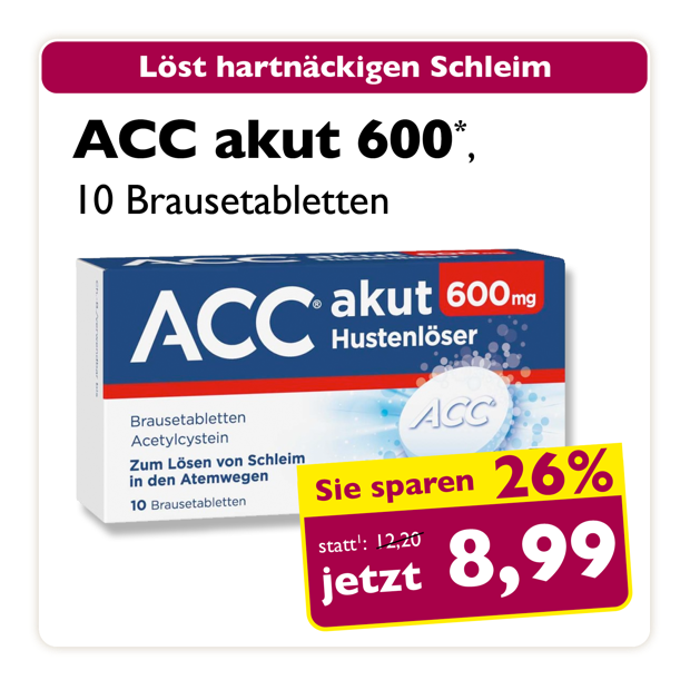 * Zu Risiken oder Nebenwirkungen lesen Sie die Packungsbeilage oder fragen Sie Ihren Arzt oder Apotheker. Abgabe in haushaltsüblichen Mengen. Solange der Vorrat reicht. Änderungen, Irrtümer und Druckfehler vorbehalten – Stand Druckschluss. Alle Preise in Euro inkl. MwSt. Rabatte nicht kombinierbar. Gültig vom 01. bis 30.11.2025. 1 In Apotheken bundesweit einheitlicher Verkaufspreis nach der Großen Deutschen Spezialitätentaxe (sog. Lauer-Taxe), der bei Abgabe zu Lasten der Gesetzlichen Krankenversicherung (GKV) berechnet wird. Es handelt sich nicht um die unverbindliche Preisempfehlung des Herstellers. 2 Unverbindliche Preisempfehlung des Herstellers.