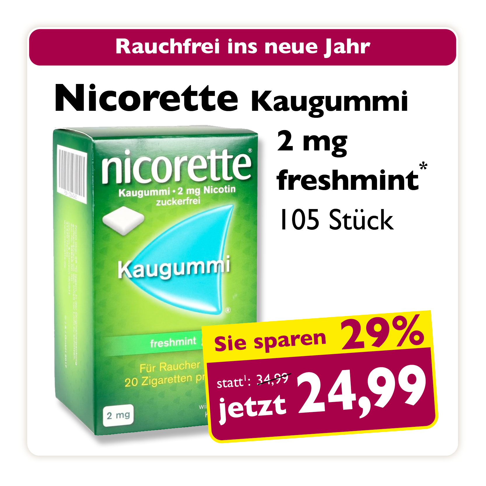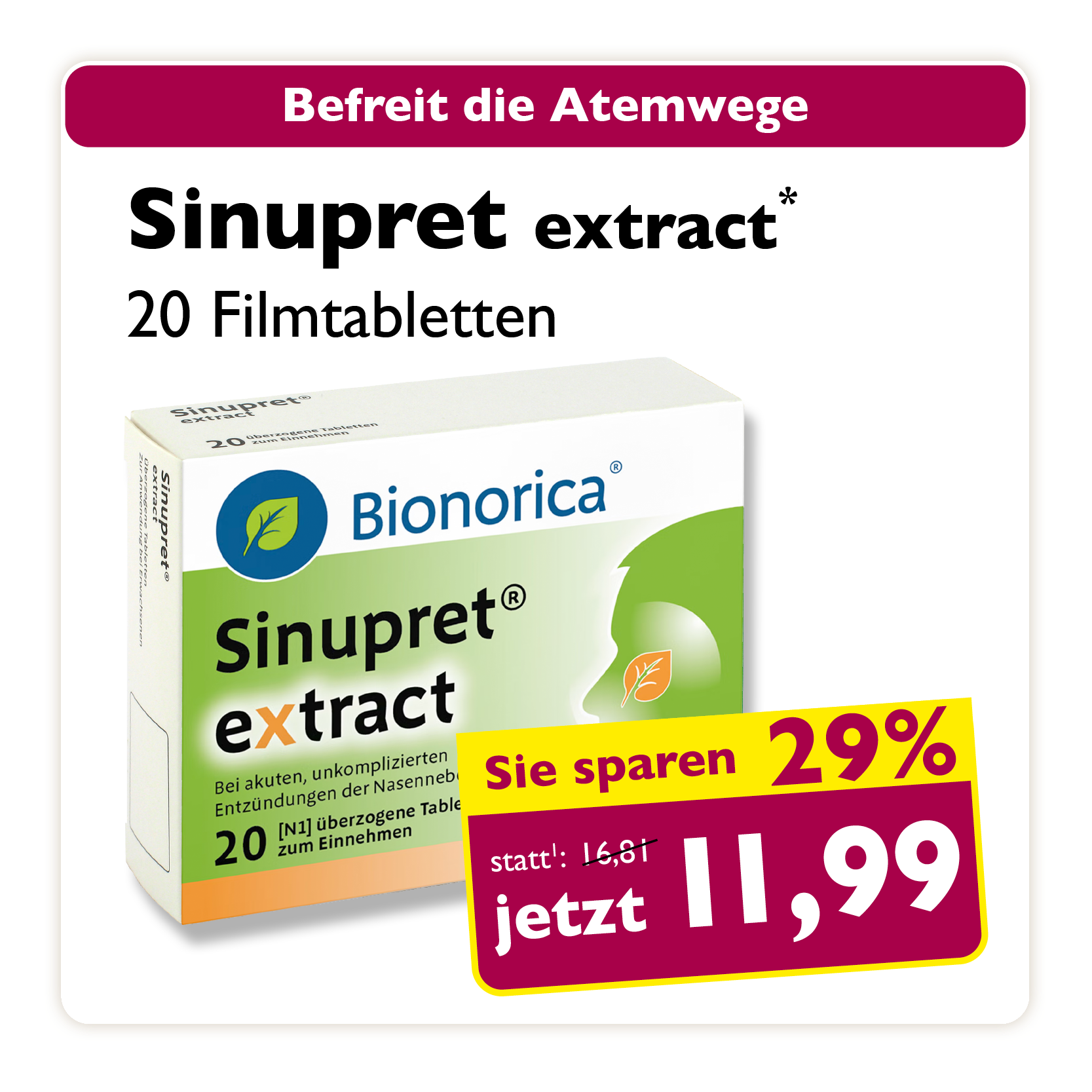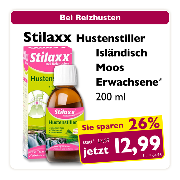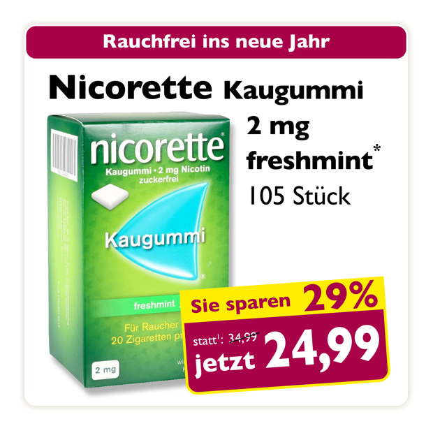 * Zu Risiken oder Nebenwirkungen lesen Sie die Packungsbeilage oder fragen Sie Ihren Arzt oder Apotheker. Abgabe in haushaltsüblichen Mengen. Solange der Vorrat reicht. Änderungen, Irrtümer und Druckfehler vorbehalten – Stand Druckschluss. Alle Preise in Euro inkl. MwSt. Rabatte nicht kombinierbar. Gültig vom 01. bis 31.01.2026. 1 In Apotheken bundesweit einheitlicher Verkaufspreis nach der Großen Deutschen Spezialitätentaxe (sog. Lauer-Taxe), der bei Abgabe zu Lasten der Gesetzlichen Krankenversicherung (GKV) berechnet wird. Es handelt sich nicht um die unverbindliche Preisempfehlung des Herstellers. 2 Unverbindliche Preisempfehlung des Herstellers.